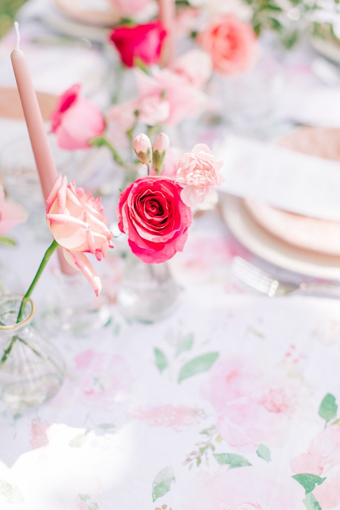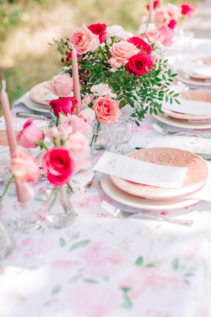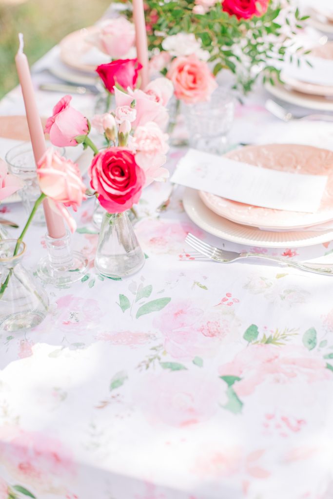Floral Blush ist das perfekte Design für alle, die frische Rosatöne und florale Akzente lieben. Die Tischdecke bezaubert mit einem Aquarell-Muster aus rosa, pinken und weißen Blüten. Dazu harmonieren zarte Rosé-Akzentteller und edle rosafarbene Weingläser. Abgerundet wird das Arrangement durch ein üppiges Centerpiece aus rosa-weißen Rosen. Ein absolutes Must-have für romantische Anlässe und alle, die verspielte Blumendekorationen schätzen.